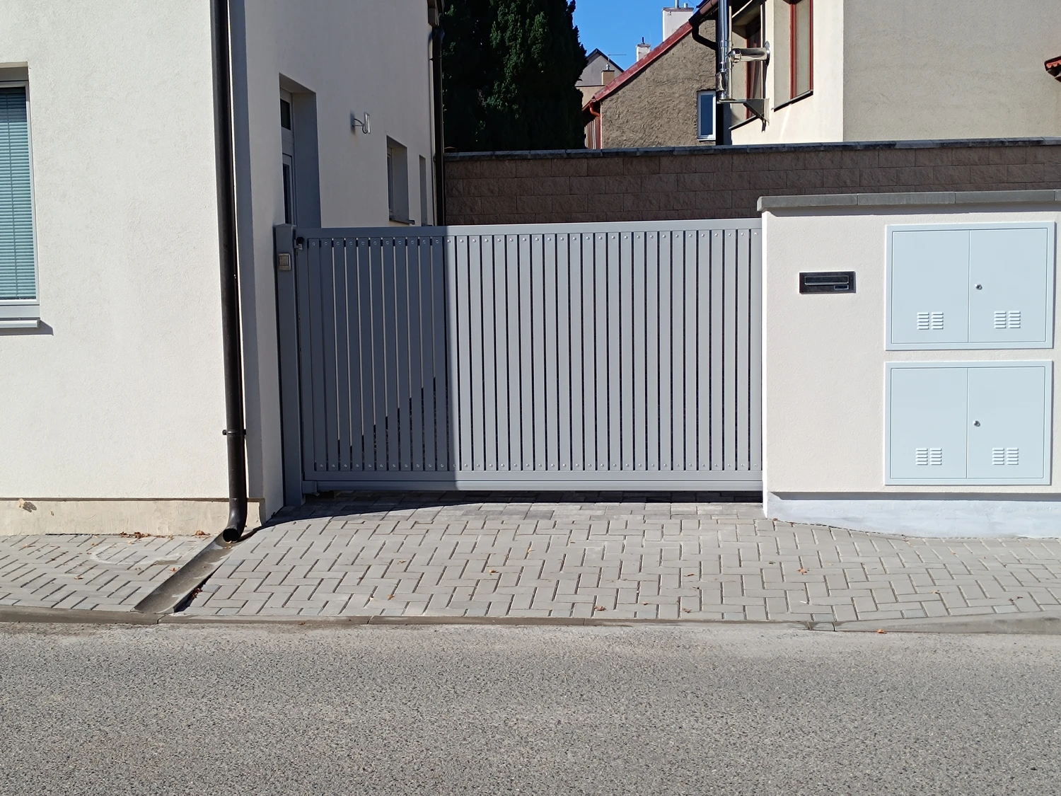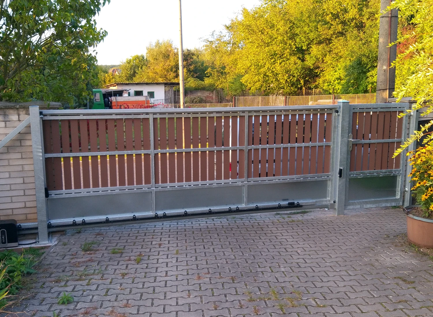 Posuvná vrata do dvora nejsou překážkou pro nasazení pohonu pro posuvné brány značek Hörmann a FAAC. Částečné otevření brány, např. pro průchod osob (lze nastavit). Pohon je uzpůsoben pro měkký rozjezd a jemné zastavení. Snadné připojení doplňkových bezpečnostních zařízení, např. zabezpečení uzavírací hrany, průjezdová světelná závora. Uzamykatelné nouzové odjištění. Bezpečné rozpoznání překážky.