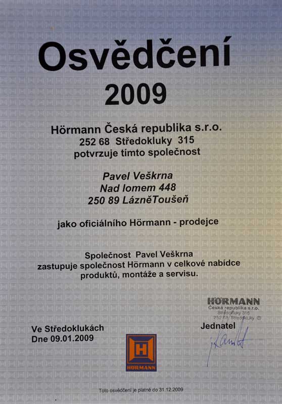 Firma Zámečnictví - Pavel Veškrna se stala certifikovaným partnerem společnosti Hörmann s. r. o. Zastupujeme společnost Hormann s. r. o. v celkové nabídce produktů včetně montáže a servisu.